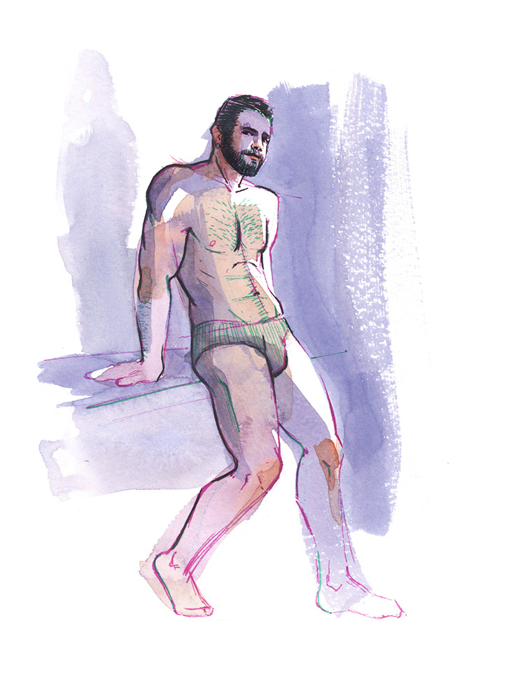 Ink and watercolor study of a semi-nude male, drawn from an Instagram photo of Insucoro. Original was painted at 6"x8.“