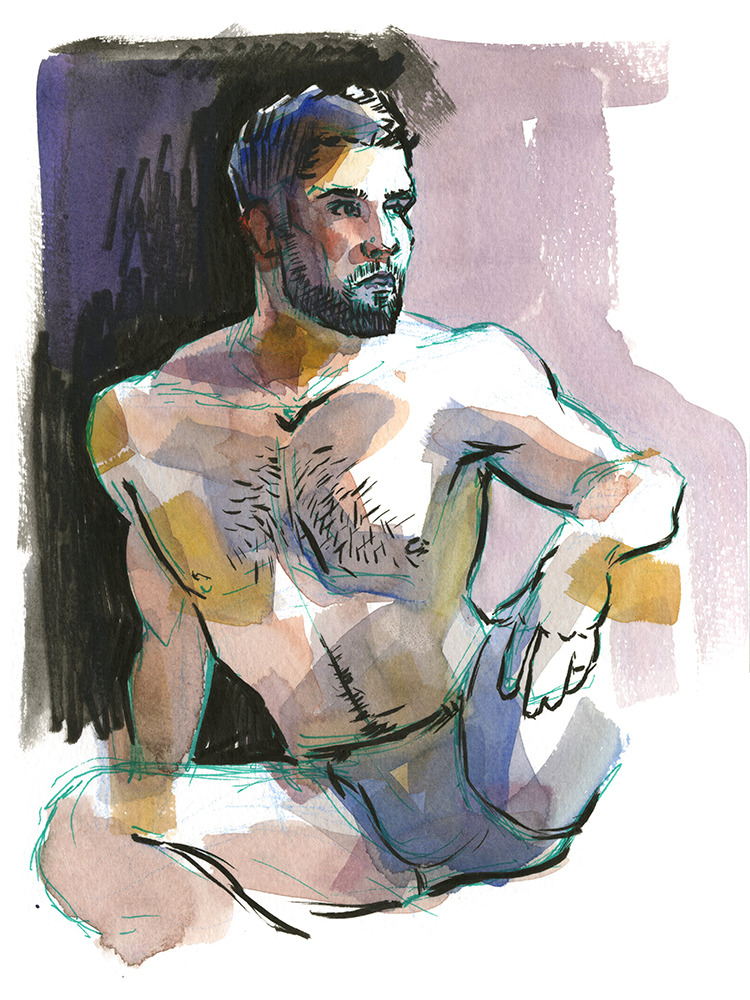 20-minute ink and watercolor study of a semi-nude male, drawn from life. Original was painted at 6"x8.“